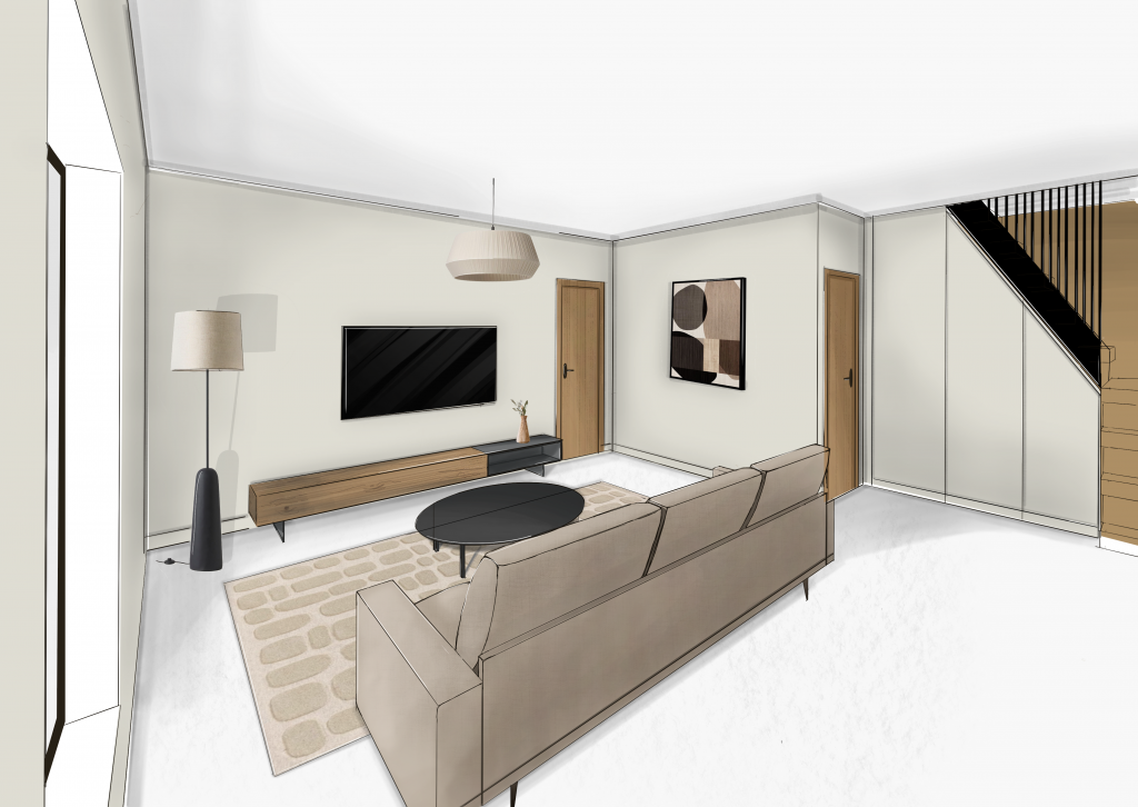 Afin de rendre l’ambiance contemporaine et de lui donner du caractère, nous avons choisi des couleurs telles que le beige, le noir et le brun.