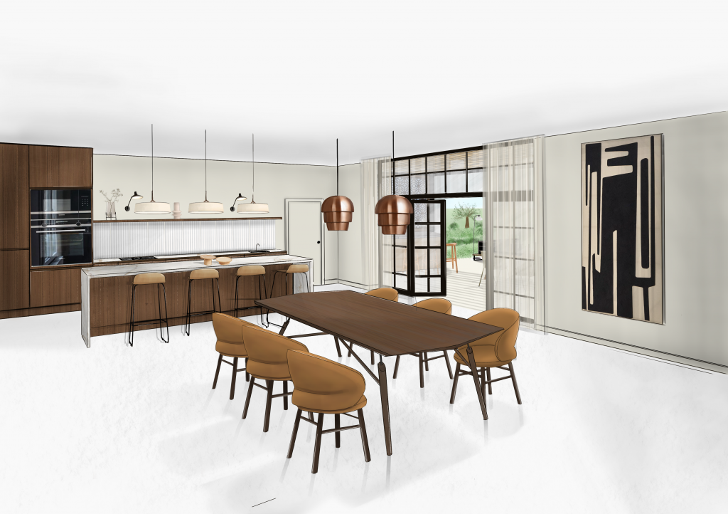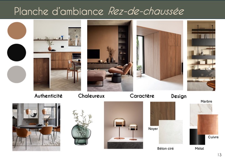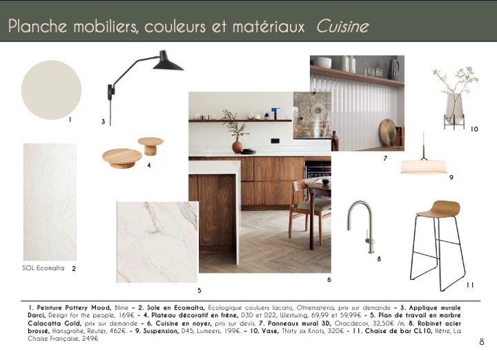 J’ai opté pour une ambiance élégante et de caractère en utilisant des matériaux nobles comme le marbre et le noyer pour la cuisine. Des matériaux modernes tels que le cuivre et le métal seront choisis pour le mobilier et les luminaires.
