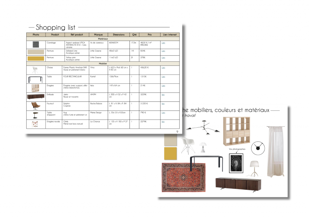 Après avoir discuté avec vous de vos envies, je vous propose une sélection de meubles et d’objets déco. Le tout est présenté sur une planche déco. Je vous envoie la liste de tous les éléments sélectionnés avec les références ainsi que le lien internet pour vous faciliter le shopping.