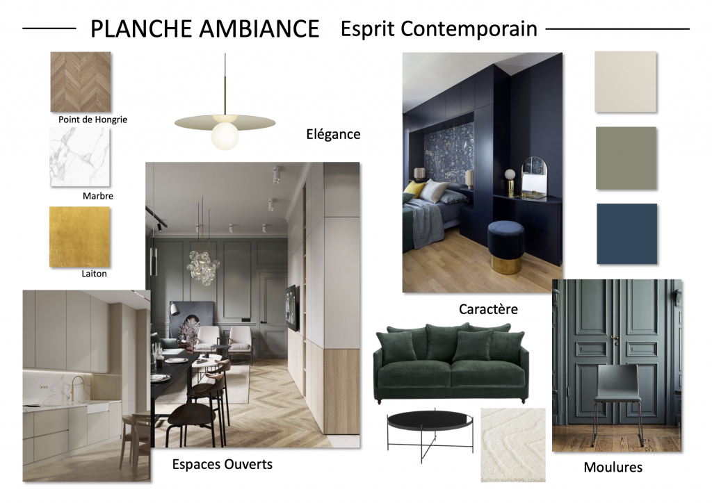 La planche ambiance vous aide à imaginer l’atmosphère générale de votre futur espace. Cette première phase d’inspiration vous donne une ligne directrice pour votre projet.